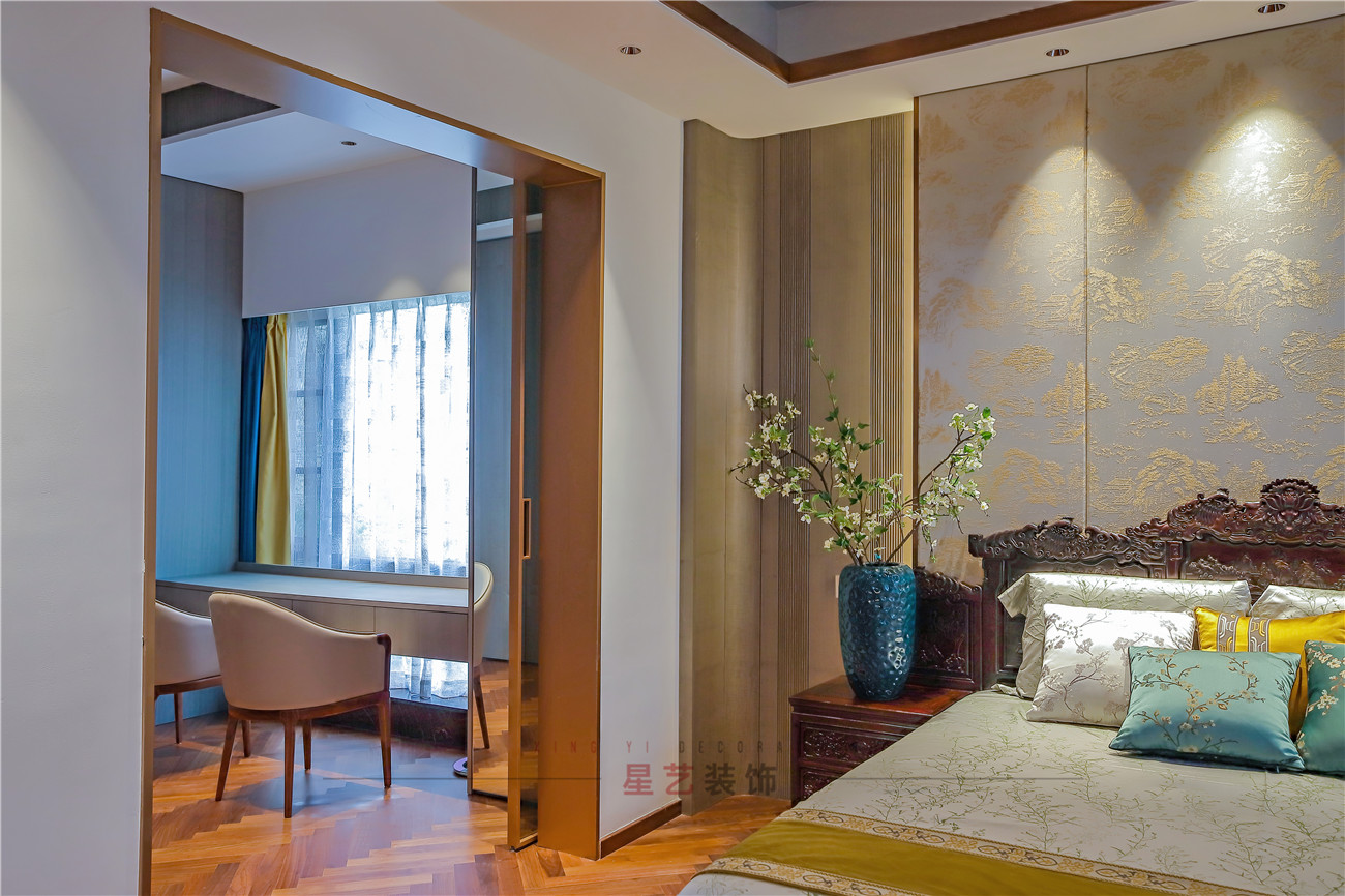 臥室用豐富的色彩搭配營造了一個溫馨舒適的環境,若隱若現的山水背景墻和枝椏圖案仿佛處在春意盎然的環境中,感受自然的勃勃生機。旁邊就可以作為化妝間,屬于愛美女性的小天地。
