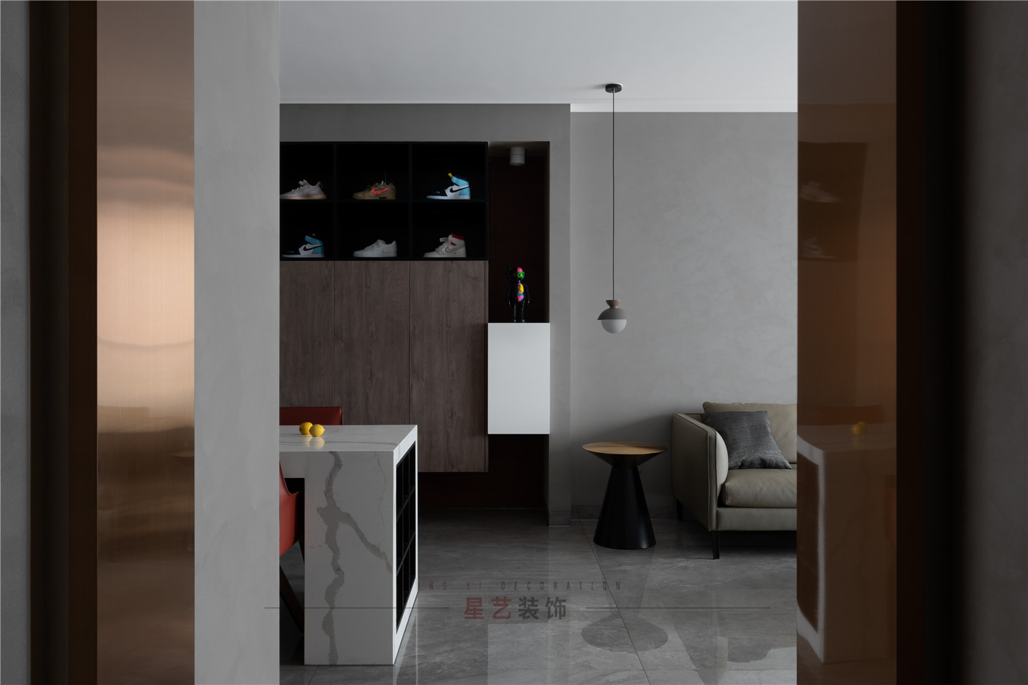 此項(xiàng)目業(yè)主是一個(gè)單身男士,喜歡收藏些手辦模型玩具和潮鞋,一直有個(gè)動(dòng)漫宇宙幻想。設(shè)計(jì)師以宇宙金星為主題展開(kāi)設(shè)計(jì),從材質(zhì)上運(yùn)用了灰色凹凸感涂料象征金星的地表質(zhì)感,用金色鏡鋼象征了金星特有的順色,黑白色的巖板代表了宇宙的光明和黑暗。