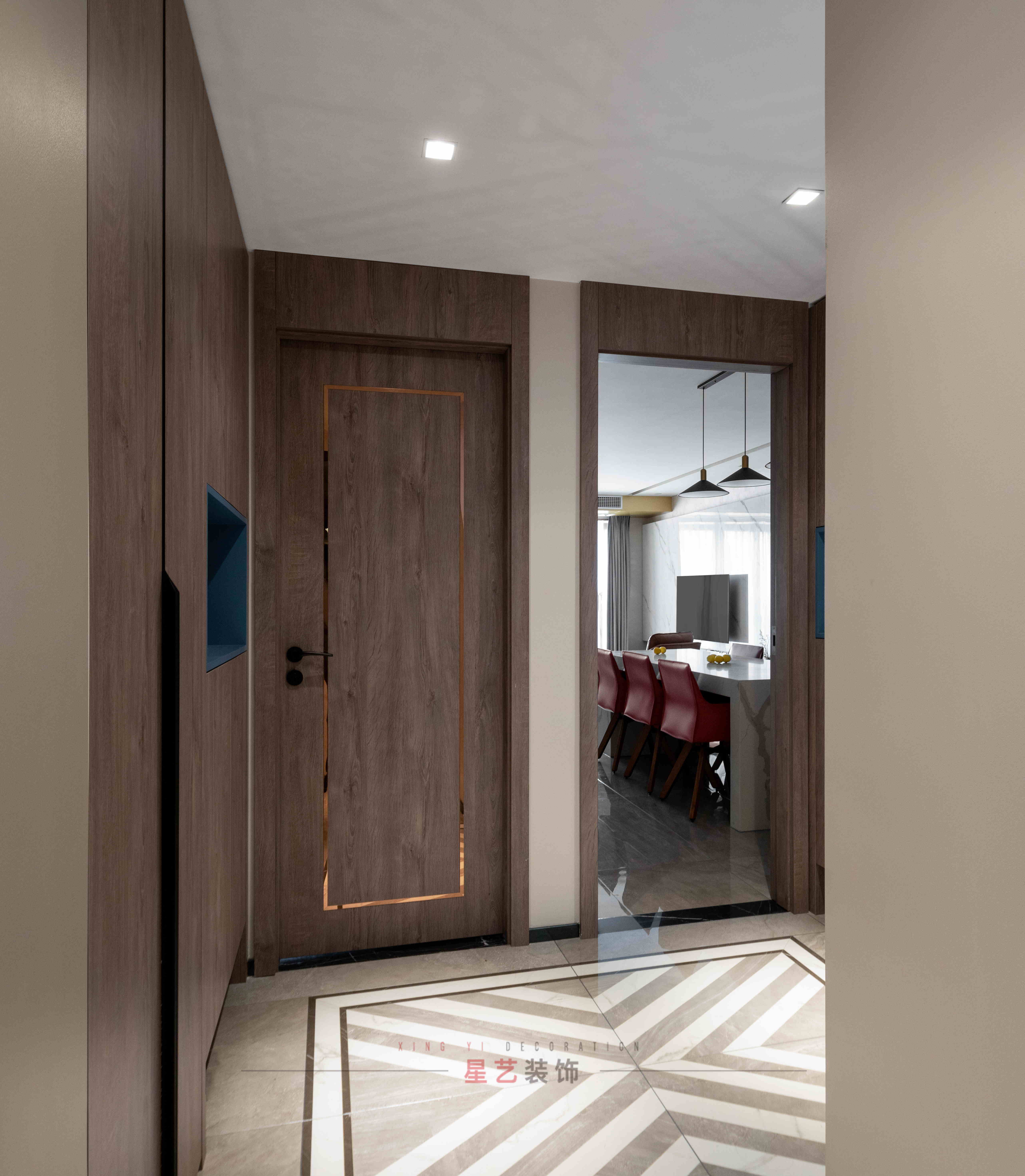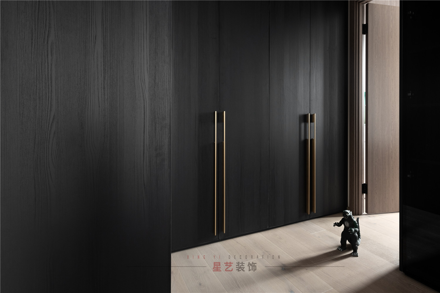 木色門(mén)嵌入金色邊框,簡(jiǎn)潔大氣充滿時(shí)尚感。
